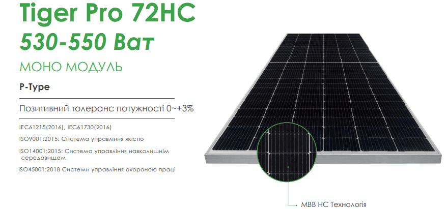 The JKM-550M-72HL4-V solar panel is a high-efficiency monocrystalline module from the world’s leading manufacturer Jinko Solar. The main advantages are 26% more power than conventional modules and lower internal current and hotspot temperature.