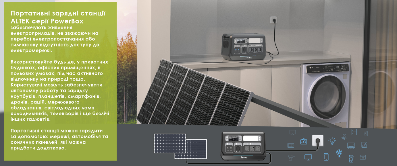 Портативні станції ALTEK можна заряджати від мережі 220В, автомобільного прикурювача, сонячних панелей або генератора. Станції ALTEK оснащенні сучасними акумуляторами LiFePO4, класу електромобілів EV.