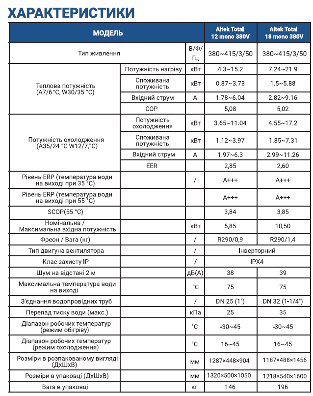 Характеристики теплових насосів Altek Total 18 mono 380V