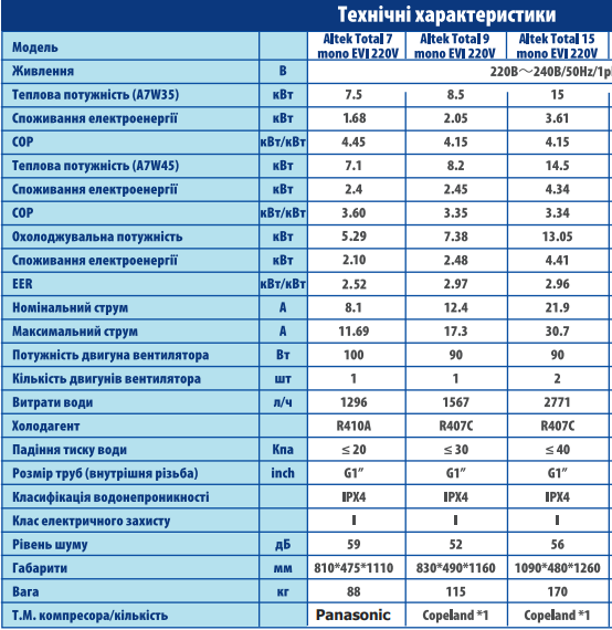 Теплові насоси ALTEK Total 7 застосовуються для створення та підтримки комфорту (опалення, нагрівання ГВП, кондиціювання, а також у комбінаціях опалення + гаряче водопостачання, кондиціювання + гаряче водопостачання) у приміщеннях цілий рік при температурі навколишнього середовища від -30°C до +45°C шляхом комплексного використання енергоефективних технологій.